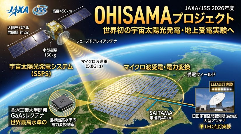 JAXAと宇宙システム開発利用推進機構(JSS)が2026年度、宇宙で作った電気をマイクロ波で地上に送り「受電して電気を取り出す」世界初の実証実験に挑む。高度450kmの小型衛星から埼玉県に向けて送電し、長野・臼田の大型アンテナでLEDを点灯させることを目指す「OHISAMAプロジェクト」の技術・課題・2050年構想を解説する。