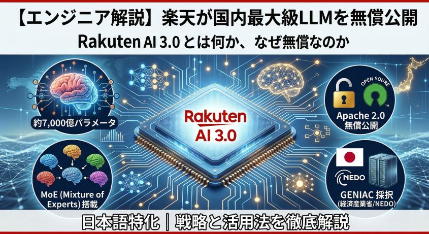 楽天が約7,000億パラメータの大規模言語モデル「Rakuten AI 3.0」をApache 2.0で無償公開。MoEアーキテクチャとは何か、GENIACとは何か、なぜ企業が最先端LLMをタダで出すのか——技術と背景を徹底解説。