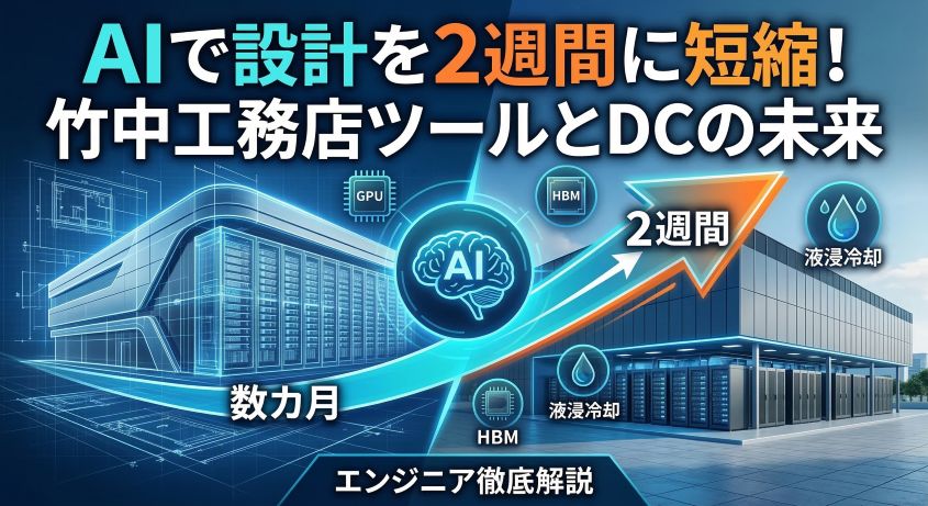 竹中工務店がデータセンター設計期間を数カ月→2〜3週間に短縮するAIツールを発表。PUE・HBM・液浸冷却まで技術的根拠を徹底解説。メモリ価格が下がらない本当の理由とは?